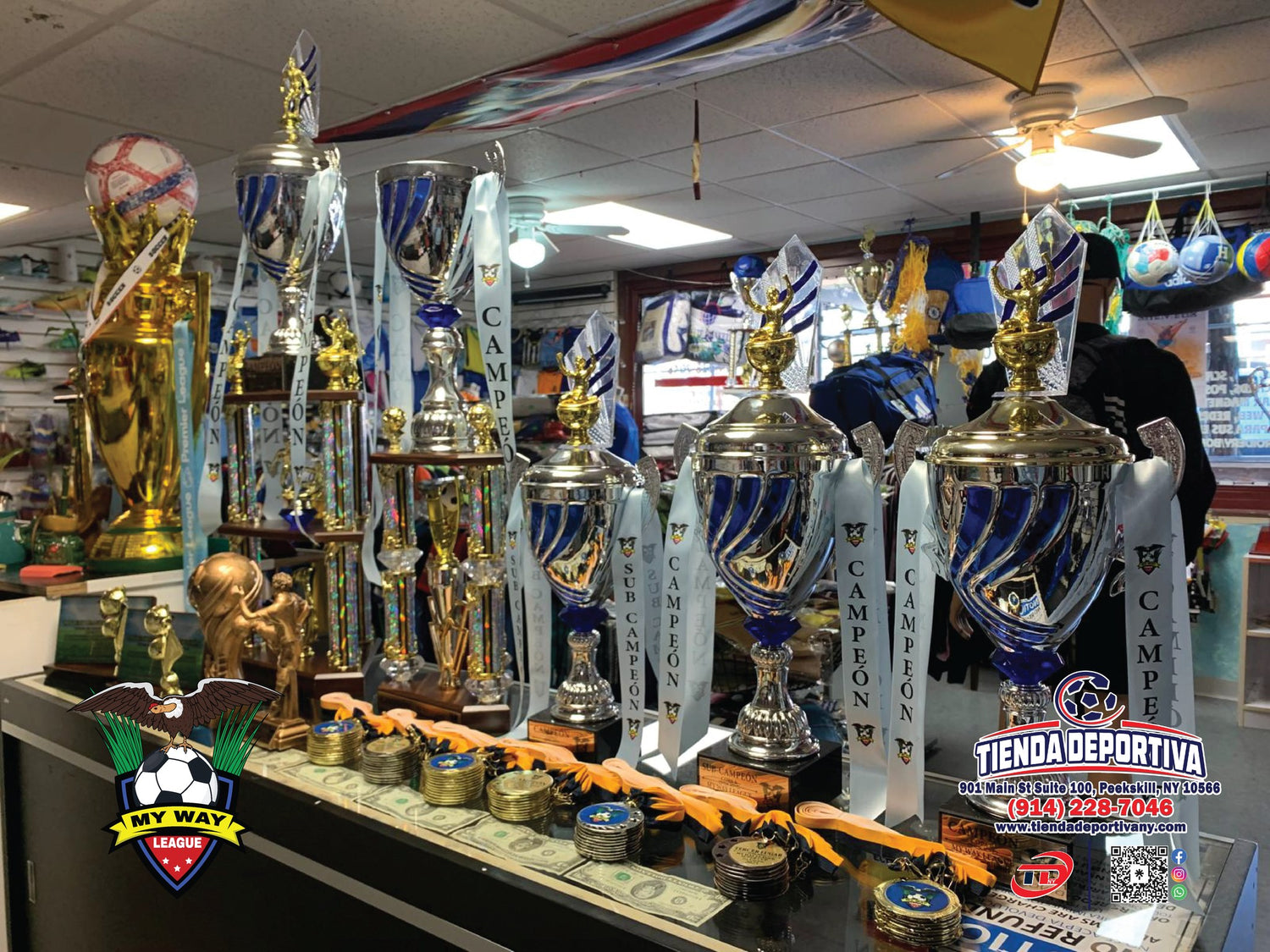 ¡Todo listo para la gran final de MY WAY League de hoy! Aquí están los trofeos, medallas y premios que preparamos para este emocionante evento. Felicitamos a los equipos Revolución y Aventureros por su esfuerzo y dedicación para llegar hasta aquí. Les deseamos mucho éxito en este gran partido. ¡Denlo todo en la cancha y que gane el mejor! Agradecemos a MY WAY League por confiar en nosotros una vez más. Es un honor ser parte de estos momentos especiales y celebrar el talento en el fútbol local. #tiendadeportivany#mywayleague#finals#fútbol#trofeos#medallas#Campeones